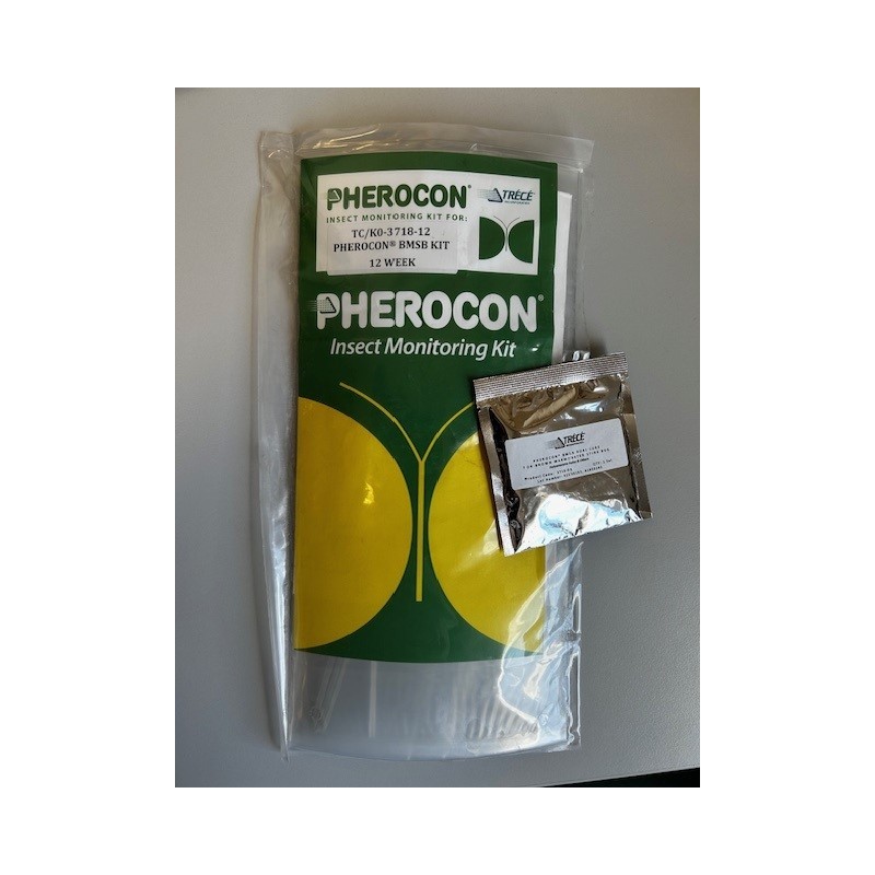 Kit complet incluant : les attaches flexibles + 2 pièges collants double faces transparentes + 1 phéromone double (BMSB DUAL TM) pour 12 semaines de diffusion, détection spécifique de la punaise diabolique (Halyomorpha Halys) et autres..